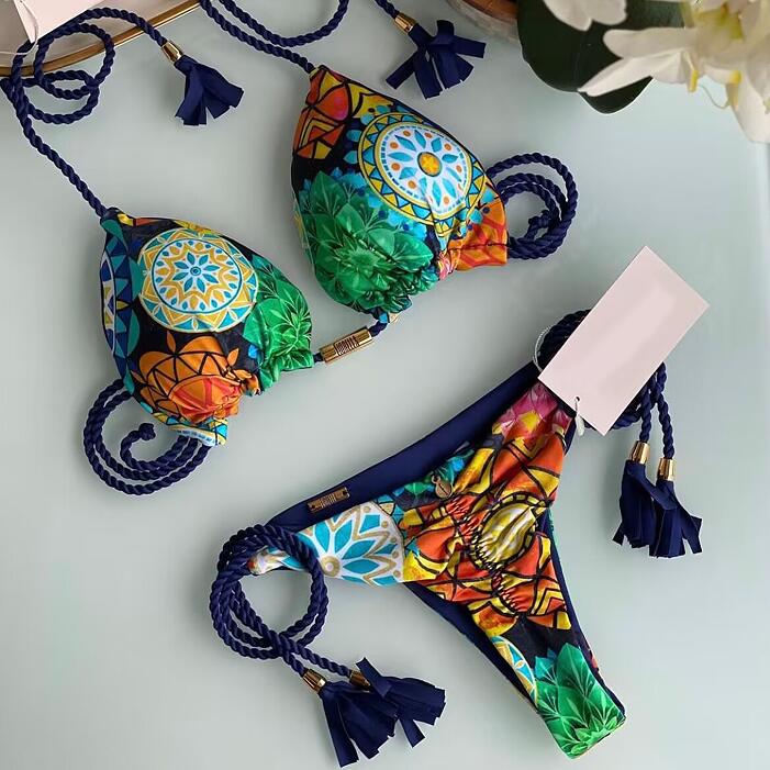 - Detalhes em franjas coloridas nas alças e nas laterais da calcinha