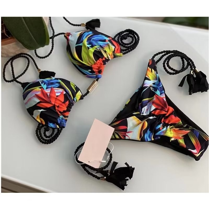 Biquini Cortininha com bojo Preto folhagens coloridas Iris