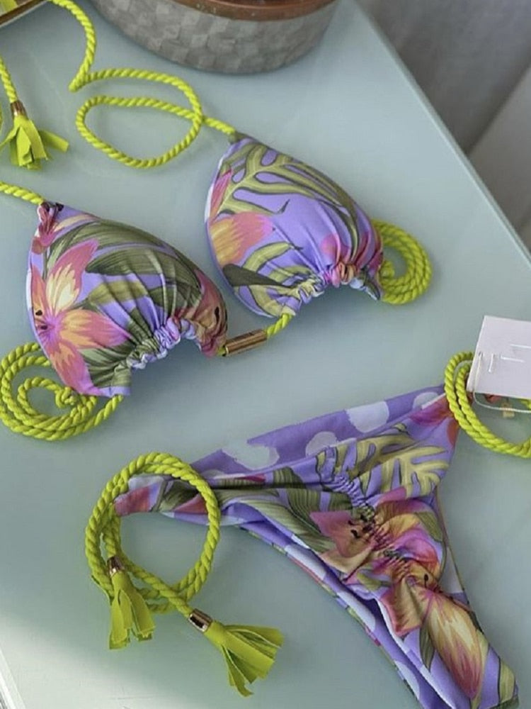 Biquini Cortininha com bojo Roxo e verde Iris