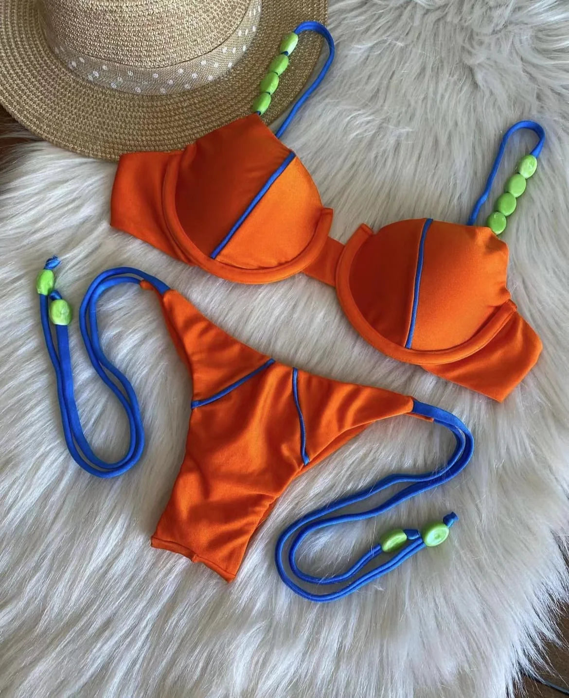 Detalhes com miçangas na calcinha e alça do sutien. Detalhes nas costuras contrastando com a cor de fundo.