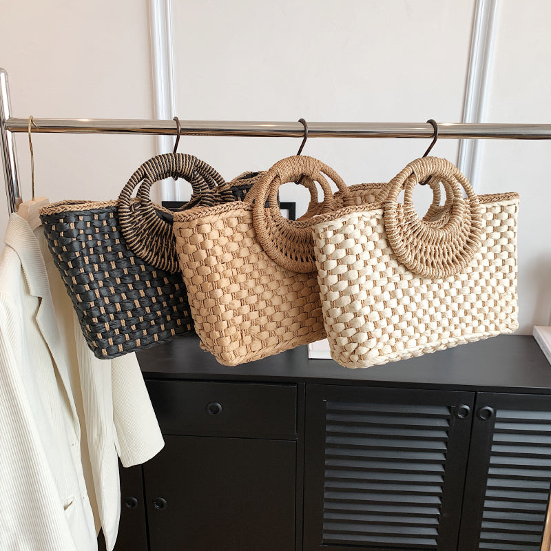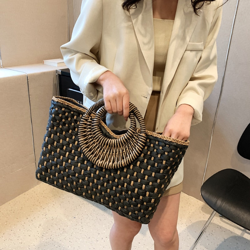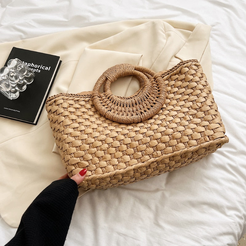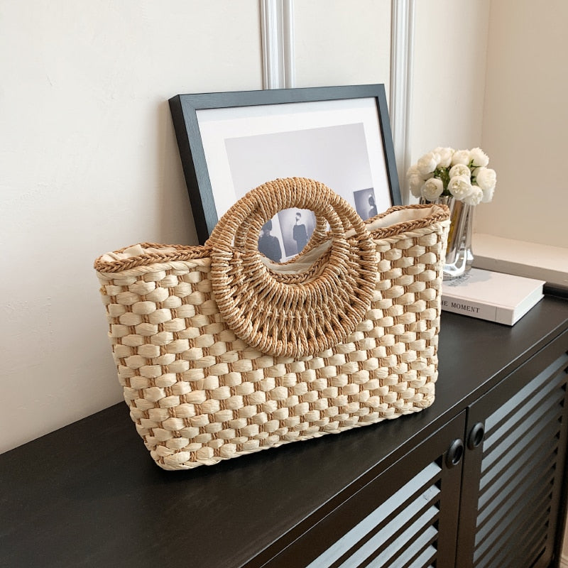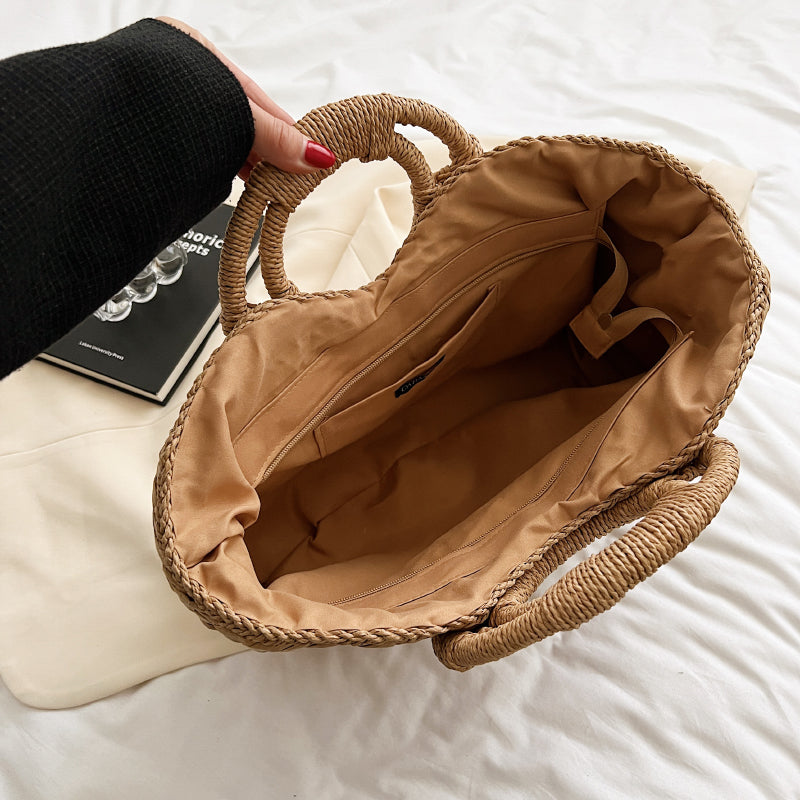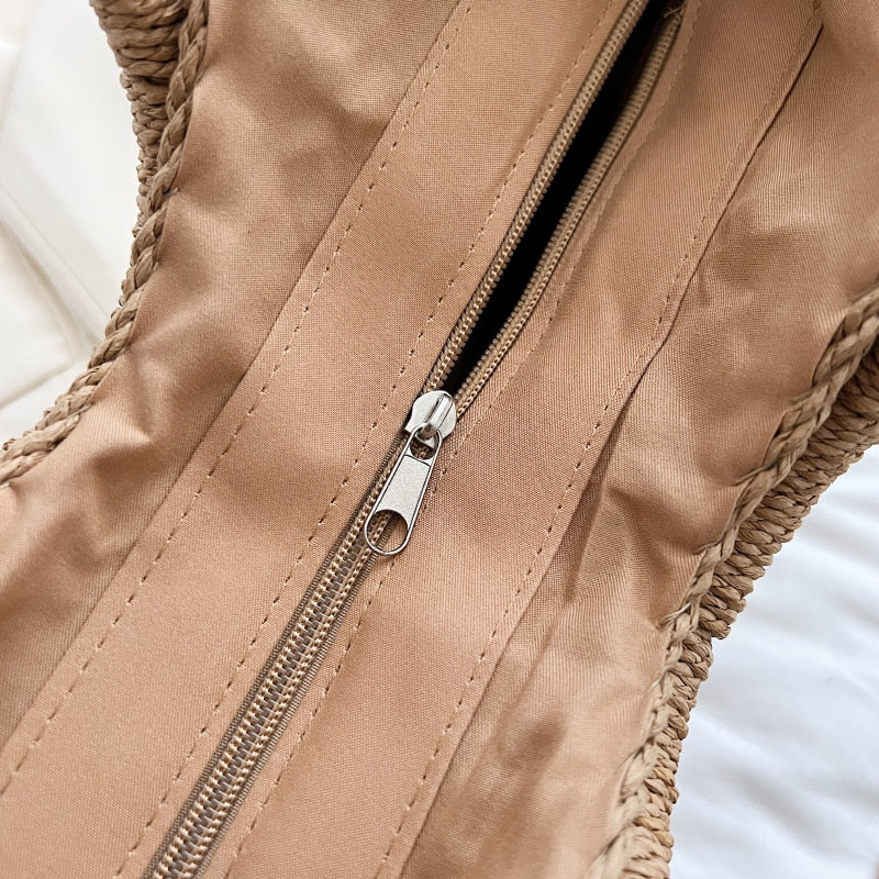 Bolsa de palha com alça redonda. Fechamento com zíper, forro com tecido, bolso interno.