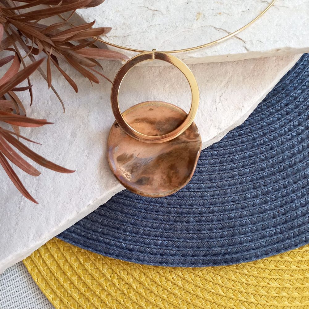 O choker Eclipse Solar é uma peça única que combina a elegância do metal dourado com a rusticidade da cerâmica. O pingente, com suas nuances terrosas e textura natural, evoca a beleza orgânica da natureza. Ideal para quem busca um acessório que une sofisticação e autenticidade.