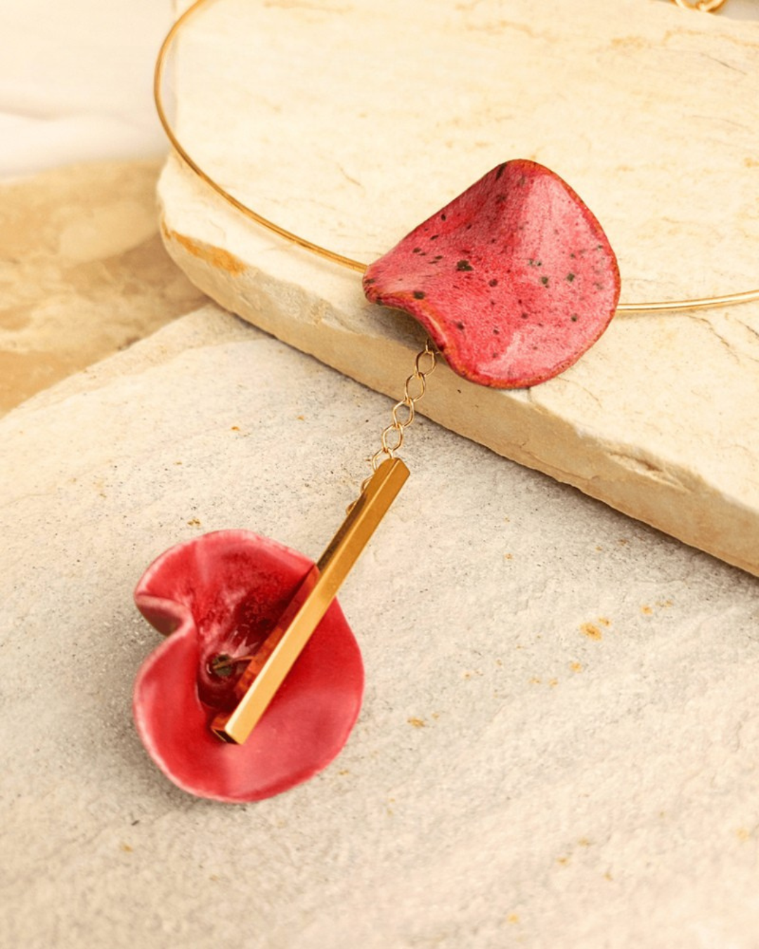As duas peças de cerâmica, uma em tonalidade avermelhada suave, são delicadamente esculpidas à mão, tornando cada cor exclusiva e especial. A corrente delicada, feita de material resistente, conecta as duas peças de cerâmica com sutileza e charme.