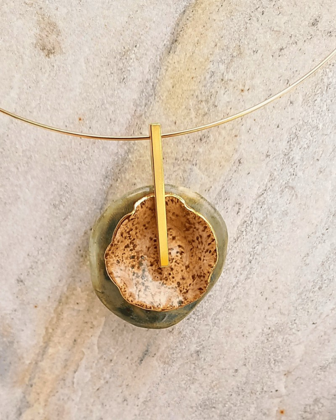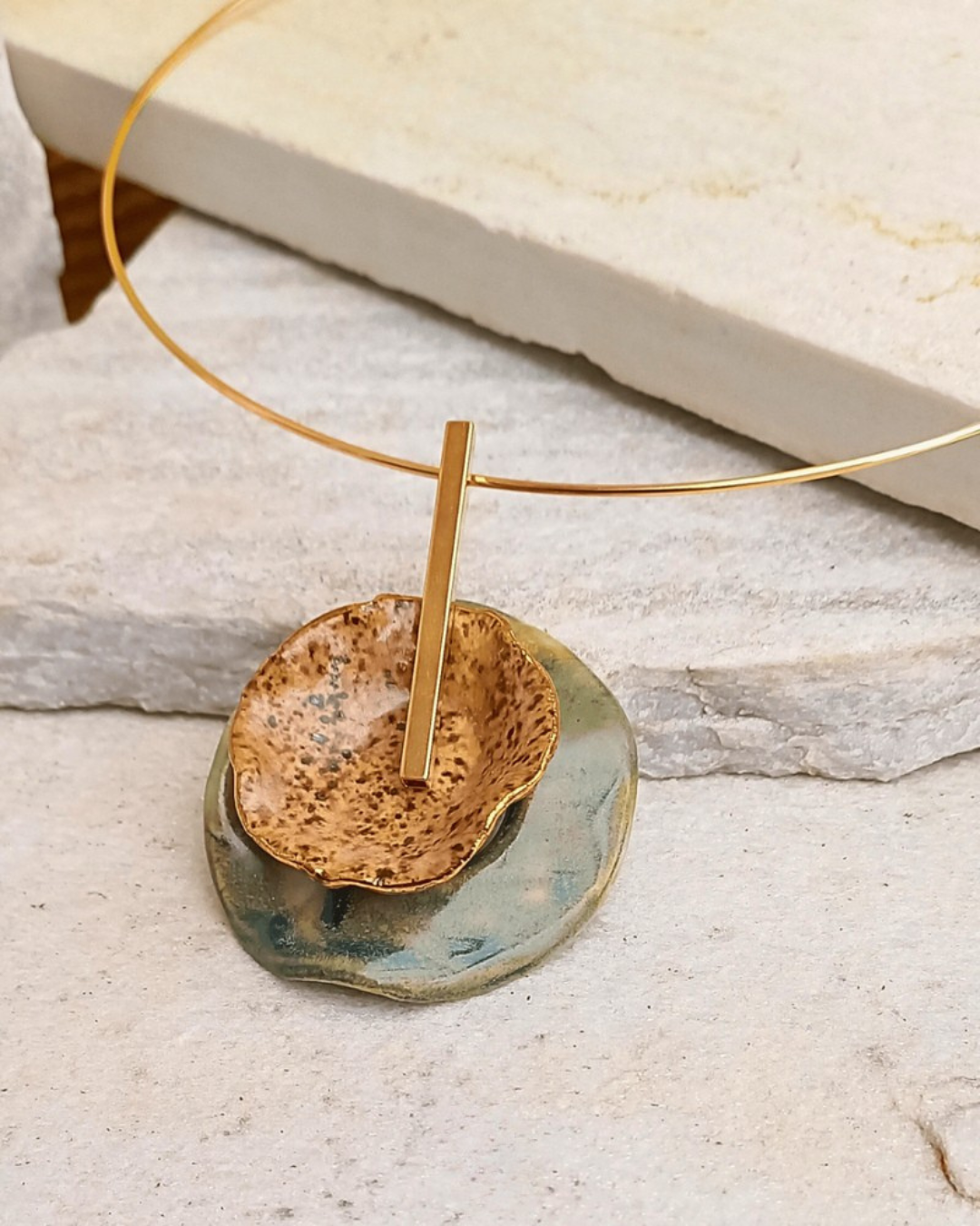 O Choker Verde Natural é uma peça de cerâmica artesanal que combina a serenidade da cor verde com a autenticidade da cor natural da argila.