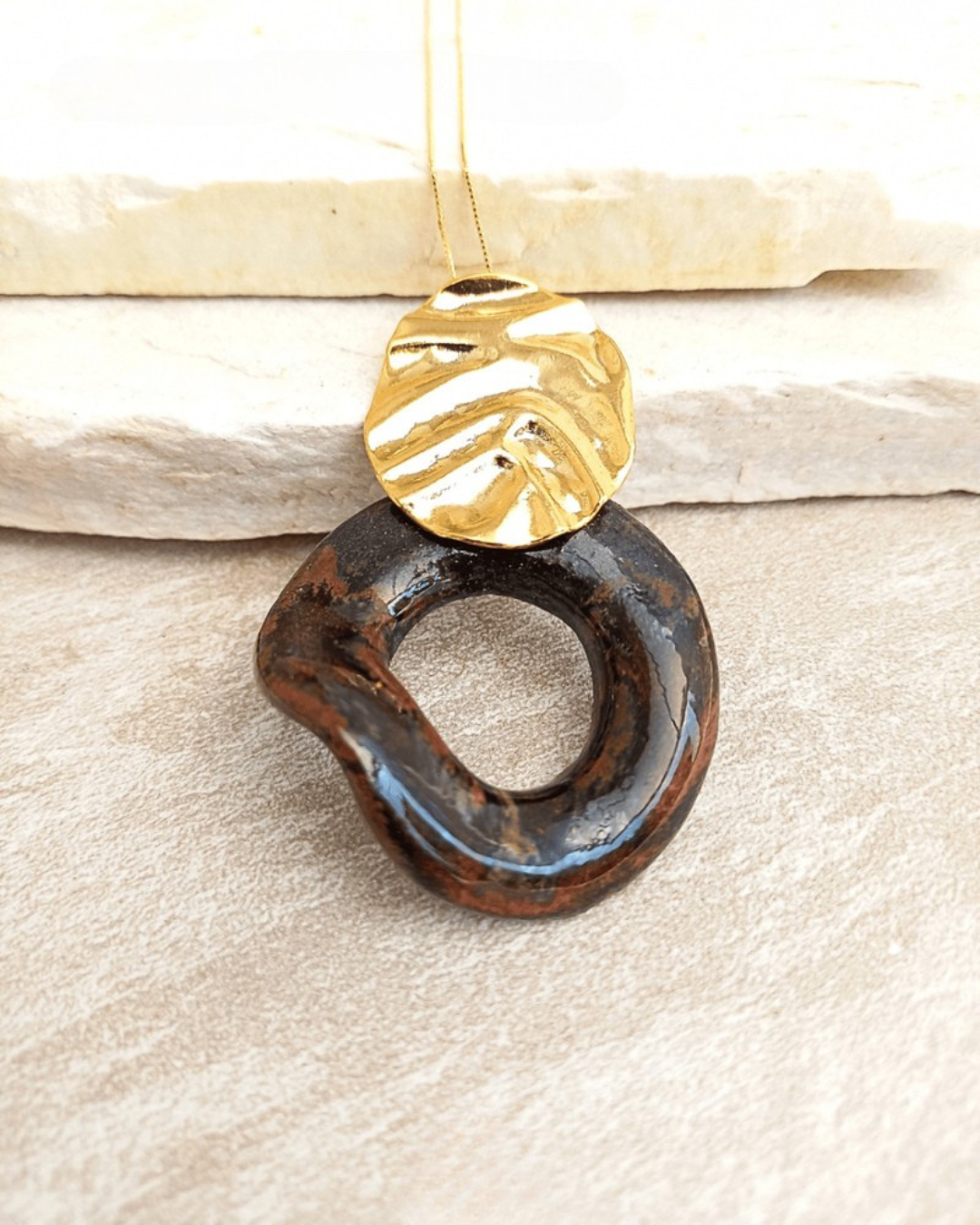 O Colar Ferrugem apresenta um design moderno e sofisticado, que combina a elegância do dourado com a beleza natural da cerâmica. O pingente principal é composto em tons escuros de ferrugem mesclada, e o metal possui uma textura que adiciona profundidade e dimensão ao colar, criando um jogo de luz e sombra que realça sua beleza. A cor terrosa do anel contrasta com o dourado, criando um efeito visualmente impactante.