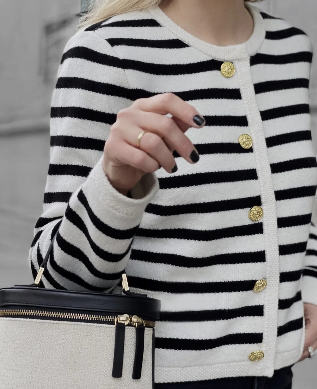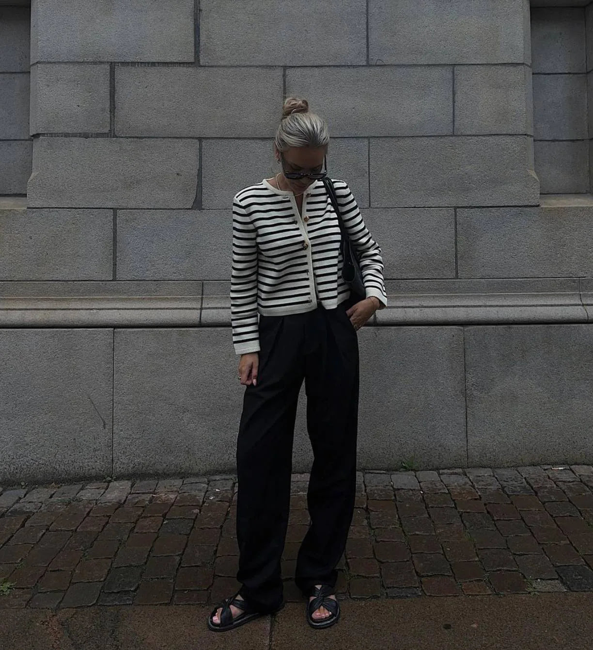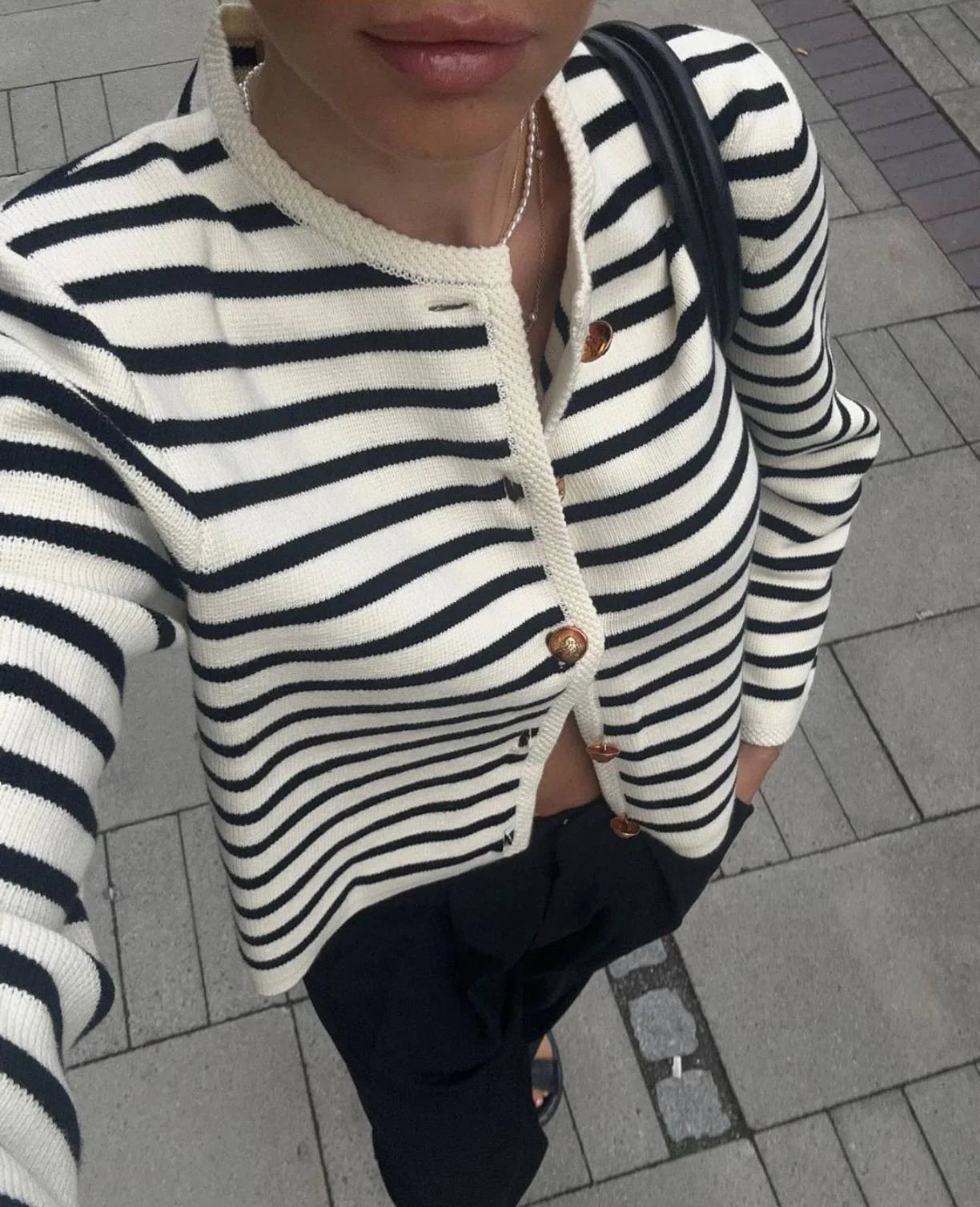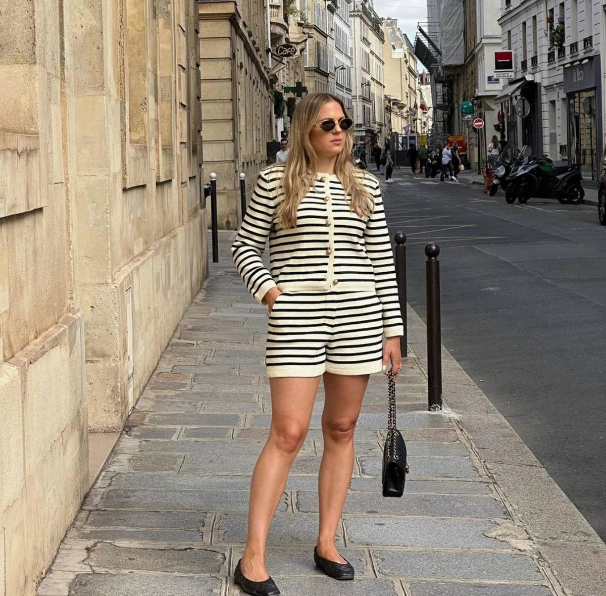Conjunto composto de shorts com elástico na cintura e bolsos laterais e cardigan, blusa manga longa com abertura frontal com botões.