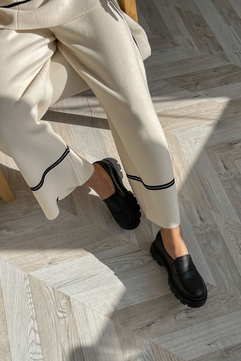 Composto por uma blusa de modelagem ampla e gola alta, garantindo um visual sofisticado e quentinho, e uma calça reta e fluida, proporcionando elegância e liberdade de movimento. Os detalhes em listras contrastantes dão um toque moderno e refinado ao conjunto.