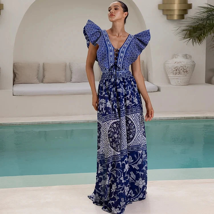 Conjunto de Maiô e Saia Longa “Zaira” com Estampa Floral Tropical em Azul e Branco