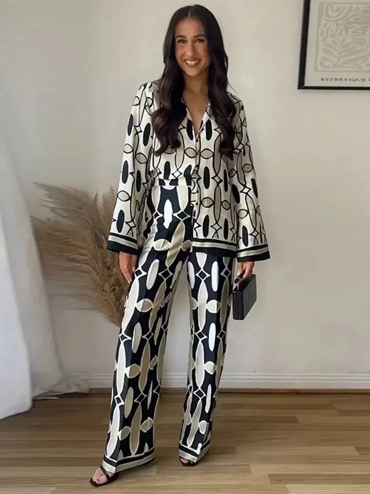 Conjunto Lumière - Estampa Geométrica com Decote em V e Calça Reta
