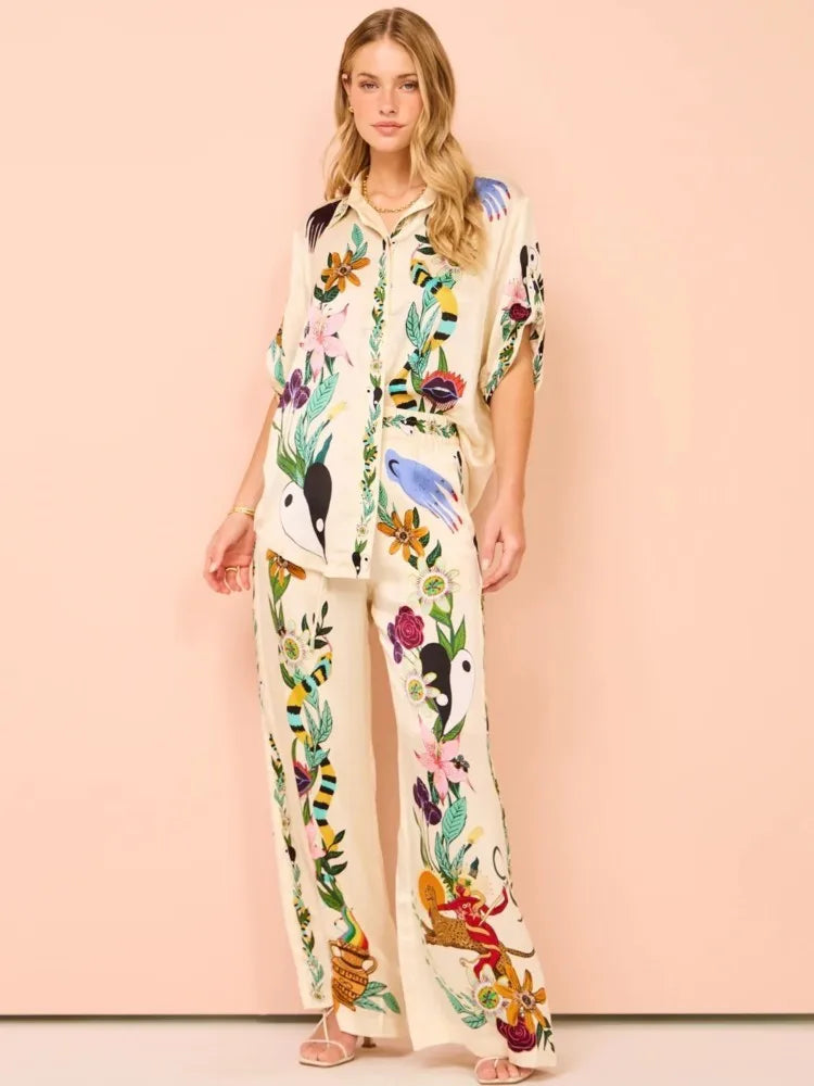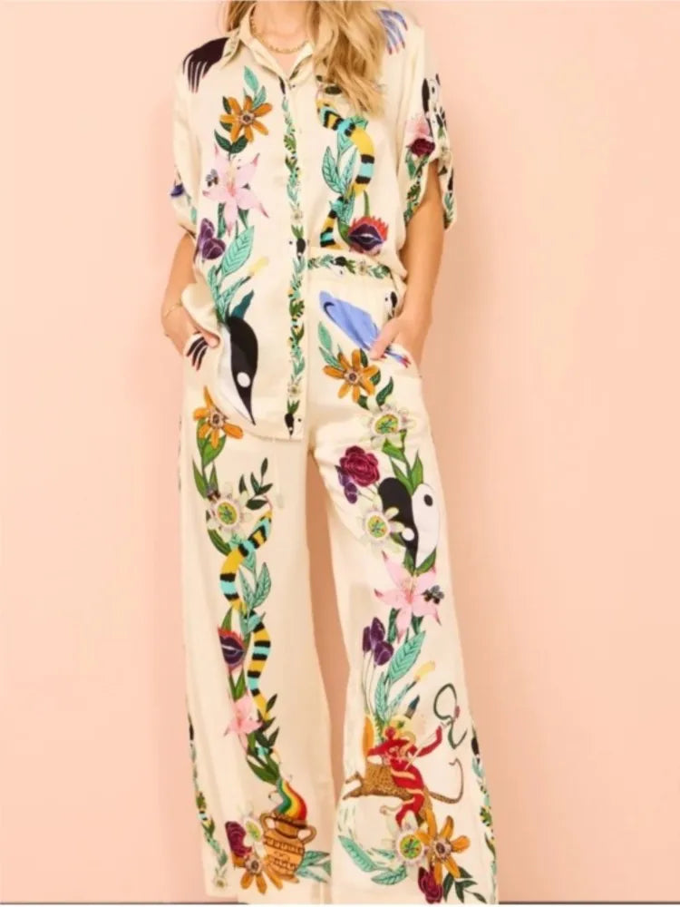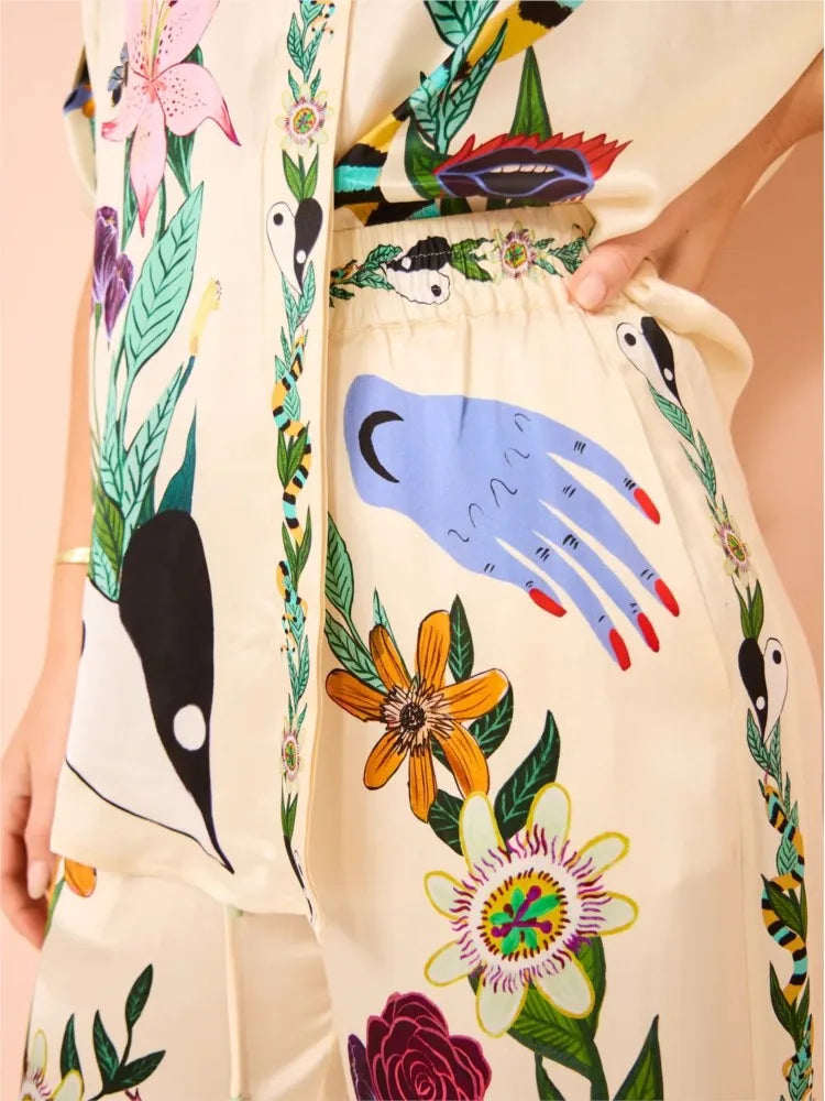 Conjunto de Camisa de manga curta e calça com amarração e elástico na cintura. Tecido de cetim toque de seda pérolas, estampado psicodélico colorido.