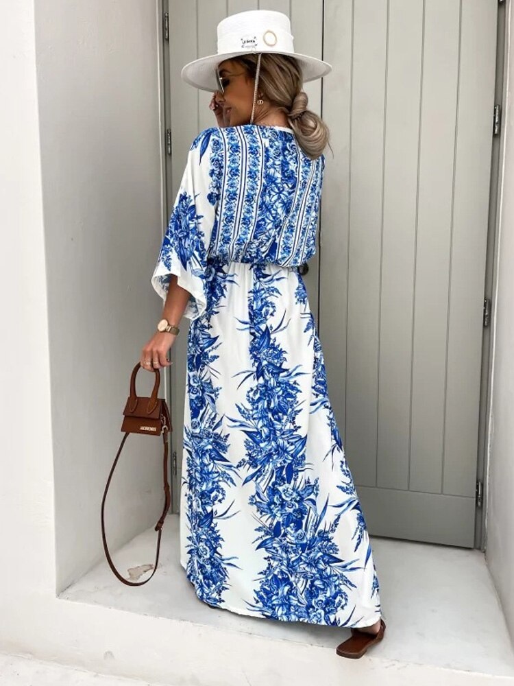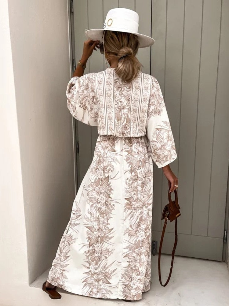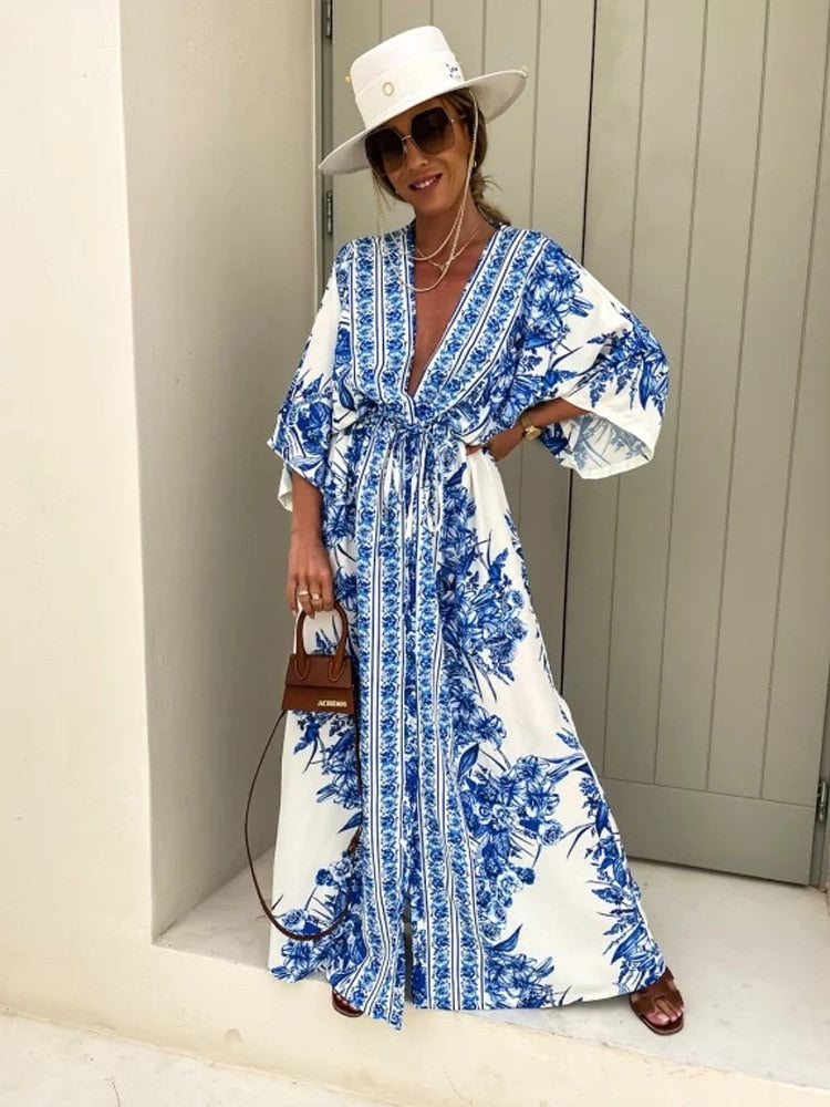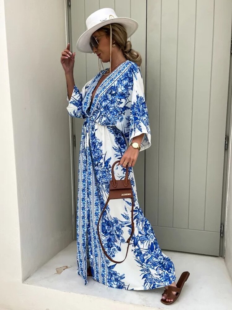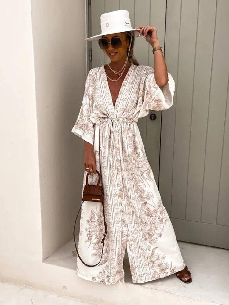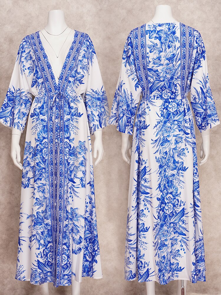 Saída de praia modelo soltinho em poliéster. Decote V com amarração na cintura e botões frontais. Mangas 3/4 largas.