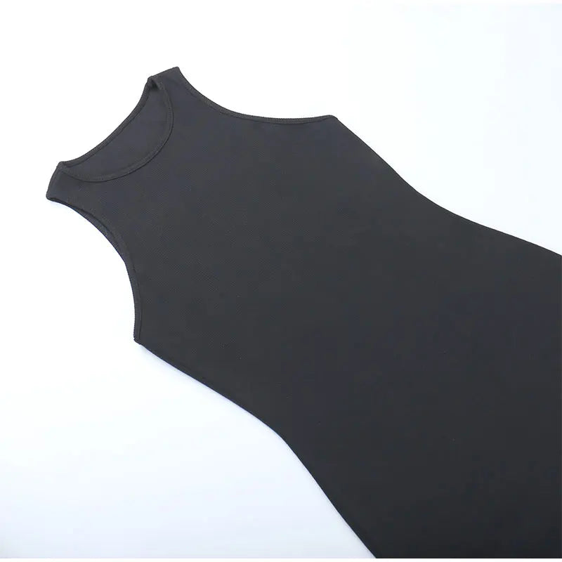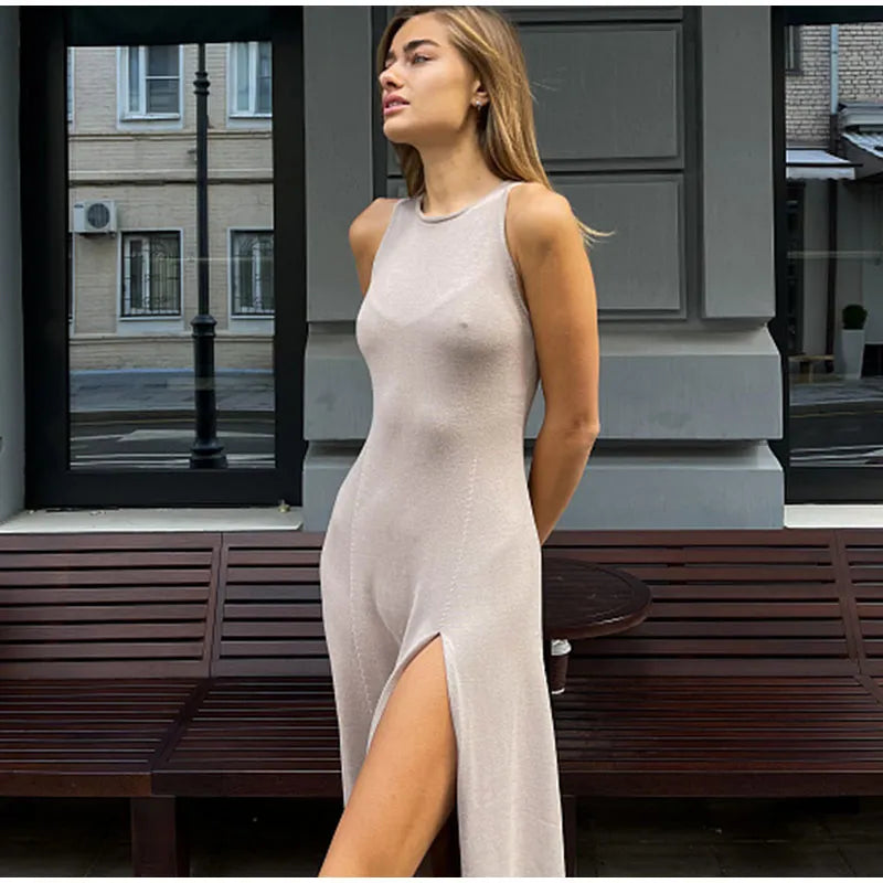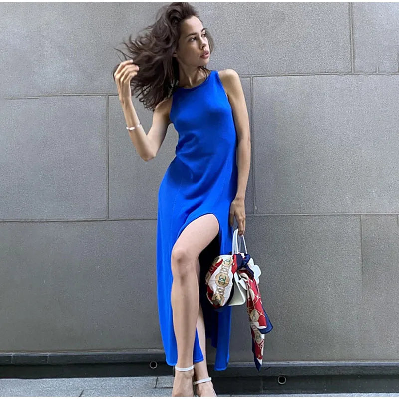 Vestido midi cor única. Possui decote canoa sem mangas, tem uma fenda na perna. O modelo é justo. Malha de tricô com elastano (estica bastante).